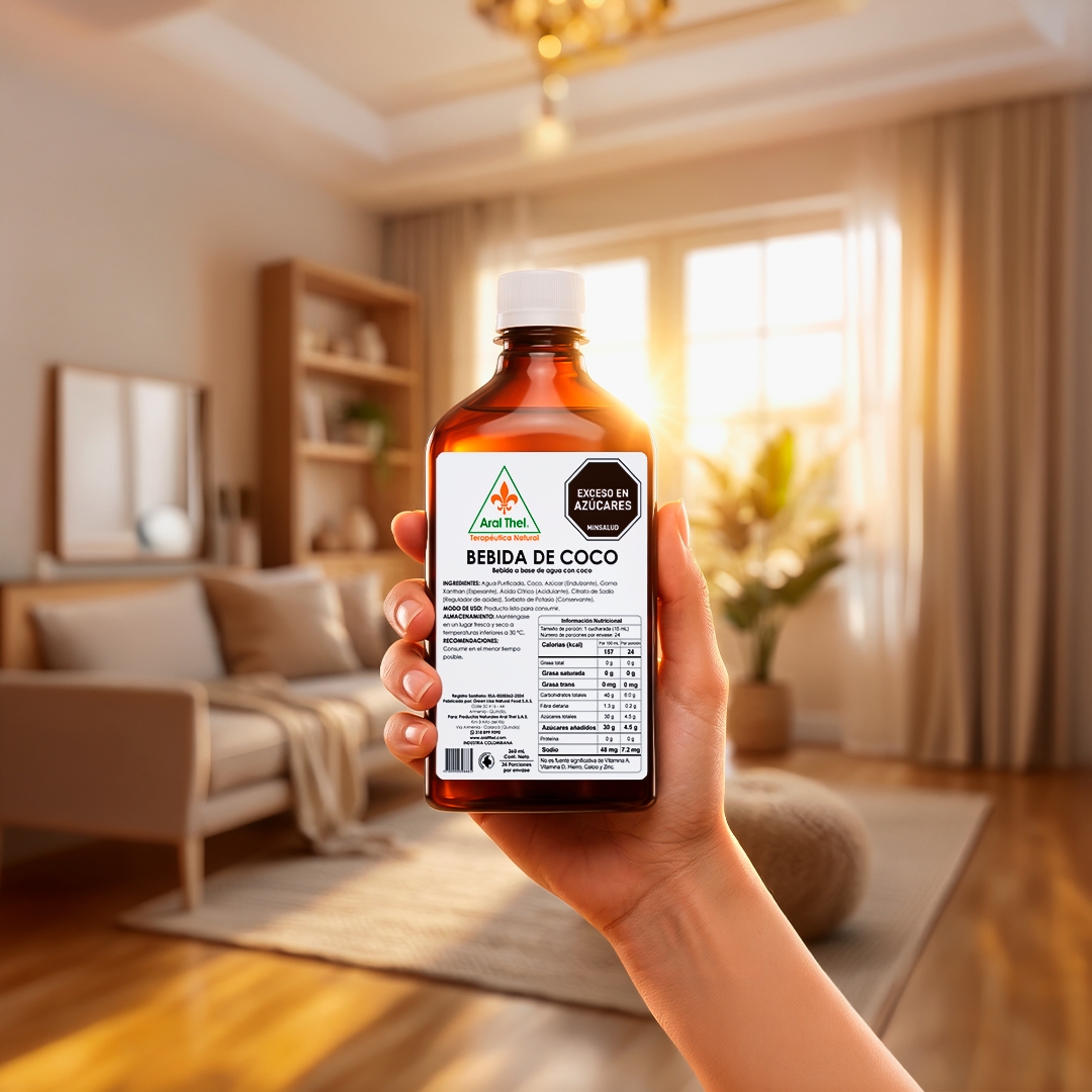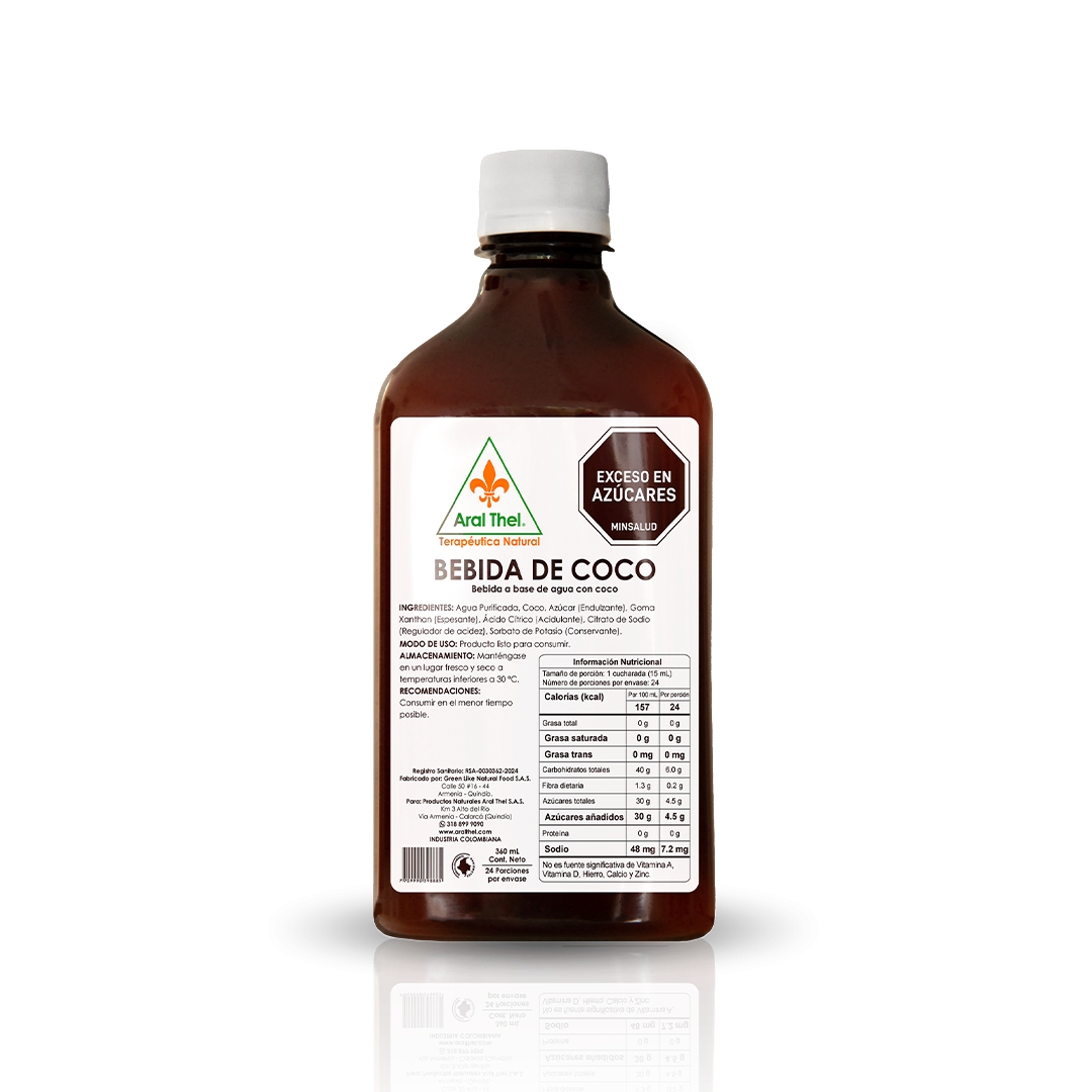 Bebida de Coco es un jarabe natural formulado a base de coco y agua purificada, utilizado como apoyo para facilitar el ablandamiento de las secreciones bronquiales. Ideal como complemento en procesos respiratorios. Presentación frasco x 360 mL.