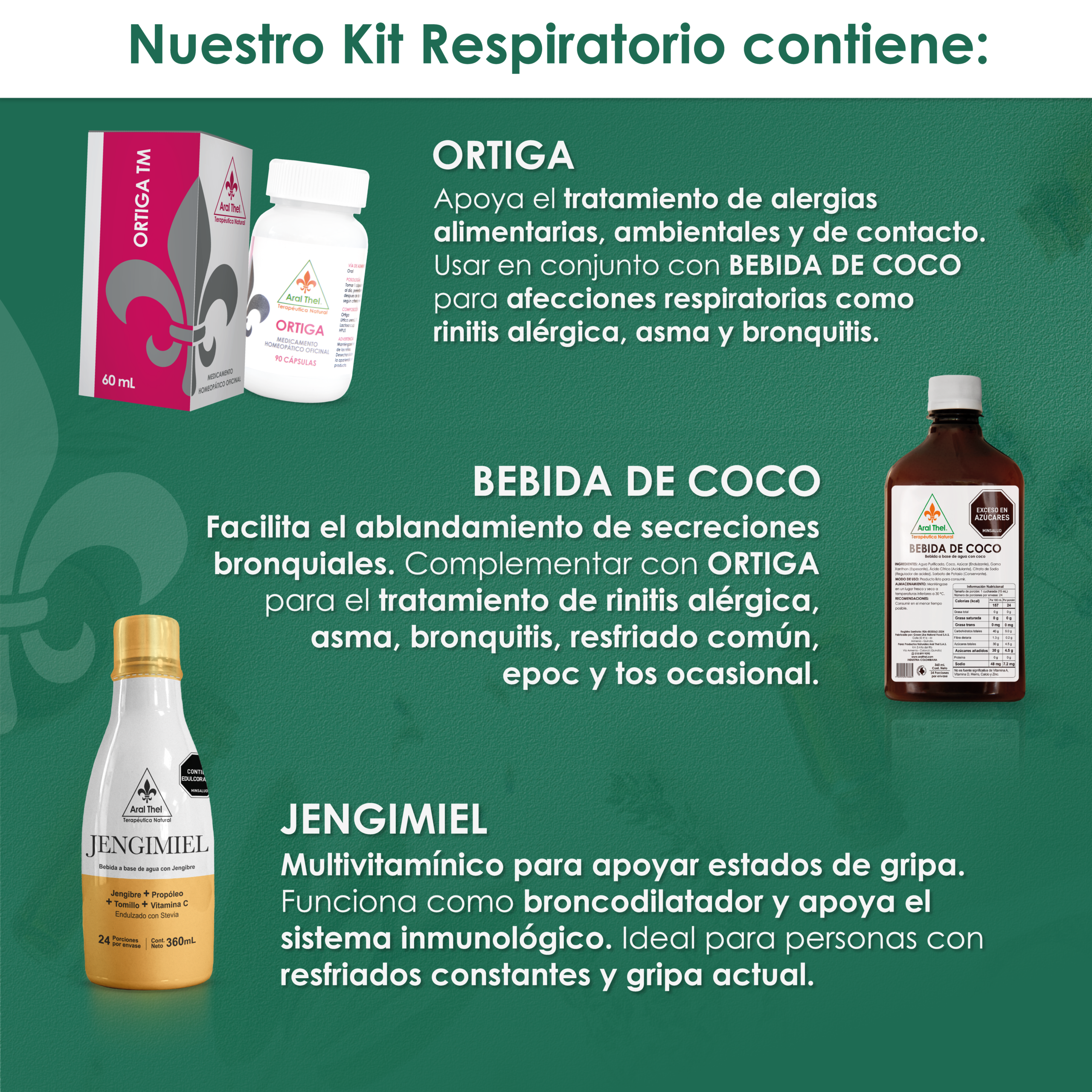 El Kit Respiratorio integra Jengimiel, Bebida de Coco y Ortiga, formulaciones naturales diseñadas para apoyar el bienestar del sistema respiratorio. Ideal como complemento en temporadas de gripa, congestión y molestias asociadas a cambios de clima. Presentación: Jengimiel 360 ml, Bebida de Coco 360 ml y Ortiga x 90 cápsulas.